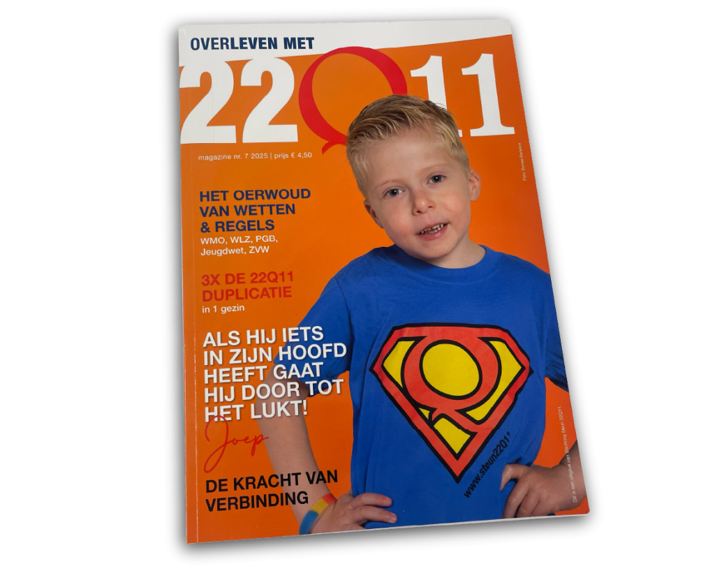Heb je het al gezien? Joep schittert op de cover van ons magazine “Over leven met 22Q11” – een uitgave vol persoonlijke verhalen, herkenning en hoop. Dit magazine raakt, inspireert en verbindt. Het is gemaakt voor iedereen die leeft met, zorgt voor of werkt rondom het 22Q11 syndroom.